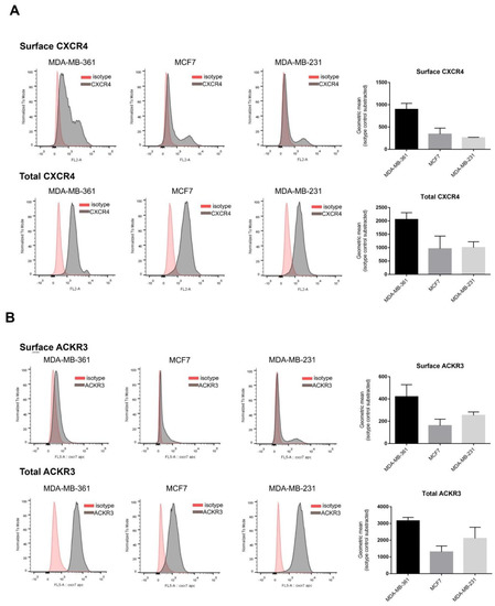 Enhanced CXCR4 and ACKR3 levels in breast cancer compared to normal tissues has been reported, although their relative abundance within molecular subtypes and in BC cellular models is unclear [29]. We thus used flow cytometry to characterize their total and plasma membrane-bound protein levels in well-established model cell lines representative of the main BC types relative to treatment options and responsiveness: MDA-MB-361 (Luminal B, Her2+ subtype, targeted therapy, high risk), MCF7 (luminal A subtype, targeted therapy, low risk) and MDA-MB-231 (triple negative subtype, chemotherapy, high risk). All BC cell lines subtypes expressed CXCR4 and ACKR3 although with different levels available for extracellular ligand binding, with an important internalized receptor pool (Figure 1). The MDA-MB-361 cell line expresses slightly more CXCR4 in the plasma membrane, while MDA-MB-231 is the one with lowest surface receptors present (Figure 1A). Total protein CXCR4 levels showed no major differences among subtypes, in line with mRNA expression data (Figure S1). As for ACKR3 (Figure 1B), the membrane-bound fraction is very low in most cell lines, especially in MDA-MB-231, whereas total ACKR3 appears to be more variable at both protein and mRNA levels (Figure S1A). The very high proportion of internalized CXCR4 and ACKR3 receptors in BC cell lines might be a consequence of agonist-induced endocytosis due to autocrine production and secretion of CXCL12. The quantification of CXCL12 in cell-conditioned media (Figure S1B) indicates that all BC lines secrete different levels of this chemokine, although these do not overall correlate with the extent of internalized receptors, thereby suggesting that other signaling components in BC cancer cells might contribute to shape a steady-state pool of intracellular receptors.
