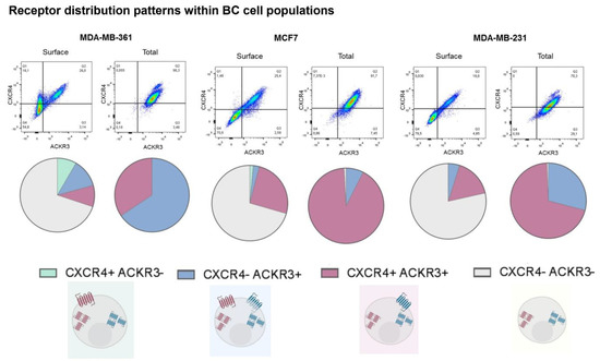 Overall, our results put forward a very variable presence of surface CXCR4 and ACKR3 across different BC cell lines and complex patterns of CXCR4/ACKR3 distribution and co-localization within cell lines, suggesting that the response of BC cells to CXCR4/ACKR3 ligands might be very heterogenous.