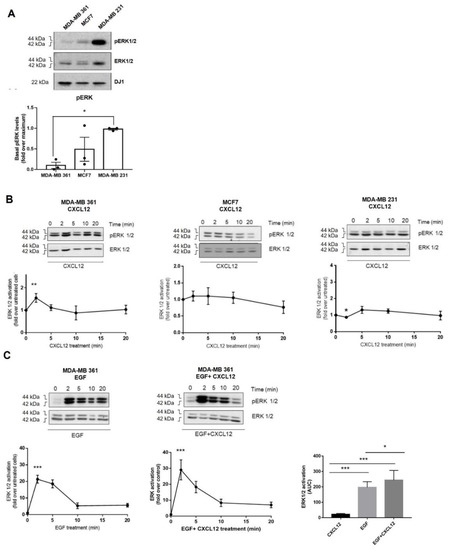 (A) Basal ERK1/2 activation levels in distinct BC cell lines. (B) ERK pathway is poorly stimulated in MCF7 (ER+), MDA-MB361 (ER+ and HER2+) and MDA-MB231 (triple-negative) cells in response to exogenous CXCL12. Serum-starved cells were stimulated with 10 nM CXCL12 for the indicated times and ERK1/2 activation assessed as detailed in Methods. Activated phospho-ERK1/2 was normalized by total ERK levels and referenced as fold change over untreated cells. Representative blots are shown. * p < 0.05, or *** p < 0.001, comparing to non-stimulated cells. (C) Simultaneous activation of the CXCL12/CXCR4/ACKR3 and EGFR pathways fosters the ERK cascade stimulation pattern in MDA-MB-361 cells (ER+ and HER2+). Serum-starved cells were stimulated with 10 nM CXCL12, 100 ng/mL EGF or the combination of both ligands for the indicated times. ERK1/2 activation was assessed and plotted as above along with the area under the curve (AUC). Representative blots are shown. Data are mean ± SEM of 9–13 independent experiments. ** p < 0.01, or *** p < 0.001, comparing to non-stimulated cells.