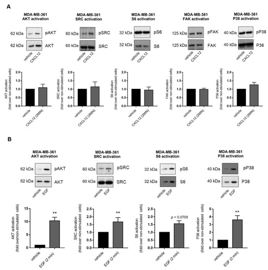(A) Exogenous CXCL12 fails to further activate other cancer-related signaling pathways in MDA-MB-361 cells (ER+ and HER2+). (B) EGF strongly triggers key oncogenic signaling pathways in MDA-MB-361 cells. Cells were serum-starved and stimulated with 10 nM CXCL12 or 100 ng/mL EGF for 2 min. Activation of ERK1/2, AKT, SRC, S6 and p38 was measured in cell lysates by western blot with phospho-specific antibodies directed against the active proteins and data normalized by levels of total proteins. Representative blots are shown. Data are mean ± SEM of 2–10 independent experiments. ** p < 0.01, comparing to non-stimulated cells.