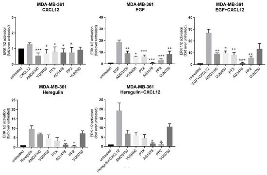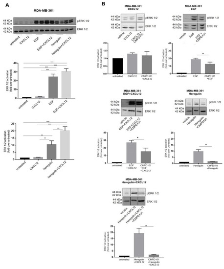 2.2. Breast Cancer Cells Differentially Activate ERK in Response to CXCL12 and ErbB Receptor Ligands