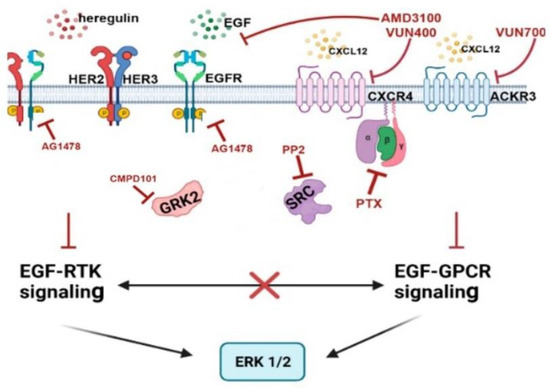 Given the frequent concurrent up-regulation of CXCR4/ACKR2 and ErbB family receptors in BC and their shared relevance for tumor growth and metastasis occurrence, investigating their interplay mechanisms in tumor contexts is of utmost importance [11].