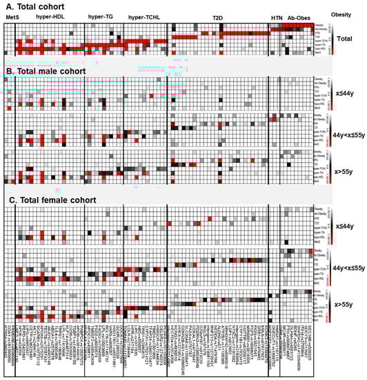 - Kim, Y.J.; Go, M.J.; Hu, C.; Hong, C.B.; Kim, Y.K.; Lee, J.Y.; Hwang, J.Y.; Oh, J.H.; Kim, D.J.; Kim, N.H.; et al. Large-scale genome-wide association studies in east Asians identify new genetic loci influencing metabolic traits. Nat. Genet. 2011, 43, 990–997. [Google Scholar] [CrossRef]