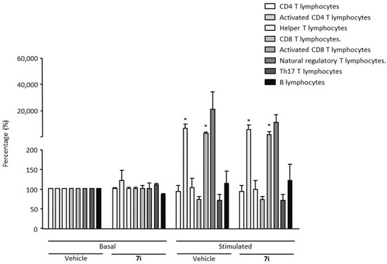 Immunotoxicity analysis. Human peripheral blood mononuclear cells (hPBMCs) were either non-stimulated (basal) or stimulated during the course of a 48-h period. Compound 7i was tested at 10 µM. Immune cell subpopulations were immunophenotyped among hPBMCs by flow cytometry. Cell percentage was evaluated. Data are presented as mean ± SEM from six individual healthy donors. * p < 0.05 vs. control (basal vehicle) condition. Wilcoxon–Mann–Whitney U test.