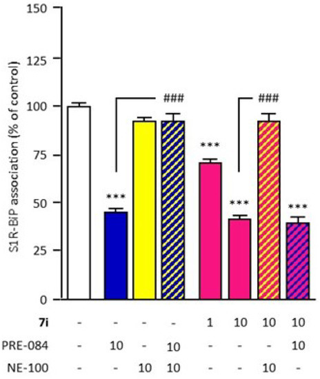 The activity of compound 7i was evaluated in regard to its ability to dissociate the S1R–BiP complex. The S1R–BiP dissociation assay was performed by Amylgen (Montferrier-sur-Lez, France) as described in [13,79]. Briefly, CHO cells were treated with test compounds for 30 min (37 °C). Crosslinking was performed with dithiobis succinimidyl propionate (DSP; Thermoscientific, Waltham, MA, USA). Lysis was performed after incubation for 15 min on ice. After centrifugation, supernatants were incubated overnight (4 °C) with the S1R antibody (Abcam, Cambridge, UK). Lysates were incubated with Sepharose Protein-A (Invitrogen). After the first centrifugation, the pellet was resuspended in radioimmunoprecipitation assay (RIPA) buffer. After a second centrifugation, the pellet was resuspended in 2× sample buffer/bMCE buffer. After the third centrifugation, supernatants were analyzed for BiP immunoreactivity (SEC343Mu ELISA, USCNK Life Sciences, Wuhan, China).