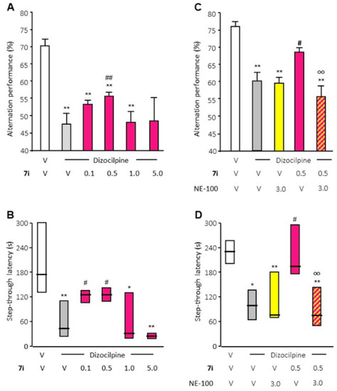The activity of compound 7i was evaluated in regard to its ability to reverse dizocilpine-induced learning deficits. Two behavioral tests were performed by Amylgen (Montferrier-sur-Lez, France) on male Swiss mice (aged 6–9 weeks). All compounds (7i and controls) were intraperitoneally injected.
