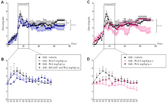 Experimental autoimmune encephalomyelitis (EAE) is a very important model for the exploration of new treatment options. Within the CNS, it reflects several pathomorphological features of MS, such as perivascular immune cell infiltration, activation of microglia and astrocytes, all contributing to demyelination and axonal loss. Relapsing EAE (R-EAE) was induced in female SJL/J mice using proteolipid protein peptide (PLP 139-151) [36,37], which classically peaked after 15 days and presented a maximal clinical score of 4.0 [27,38,39]. As compound 7i’s effects on behavioral tests are visible at a concentration range of 0.1 to 1 mg/kg, the treatment was administrated at 0.5 and 1 mg/kg in EAE mice. Daily injections were performed for 15 days when the animals reached a score 2 (i.e., tail atony and/or clumsy gait). EAE disease course was followed for 80 days in order to observe the second relapse. Daily scoring of clinical signs in a blinded manner showed that EAE—vehicle (control) mice experienced onset at day 16 (D16 ± 1) after immunization (Figure 5A,B) and presented a clinical score ≥ 2 for 8 days (first relapse). Animals kept a score slightly above 2 for 30 days before experiencing a less intense second relapse.