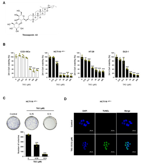 Timosaponin A3 (TA3) inhibits colon cancer cell viability and proliferation and induces apoptosis. (A) Chemical structure. (B) Effect of TA3 on cell viability in normal colonic cell line CCD-18Co and colorectal cancer cell line HCT116p53−/−, HT-29, and DLD-1 cells. Cells were treated with 0, 6.25, 12.5, 25, 50, 100, and 200 μM of TA3 for 24 h. After this, cell viability was evaluated by MTT assay with three independent experiments in each cell. (C) Colony formation photos (upper figure) and bar graph (below figure) in HCT116p53−/−cells. Cells were treated with 0, 6.25, and 12.5 μM of TA3 for 24 h. HCT116p53−/− cells were treated with TA3 for 24 h and then the new medium was changed for 10 days (every 2–3 days, the new medium was changed). After 10 days, cells were stained with Diff Quick solution 2. Then, cells were dried and counted. Statistical significance was analyzed using one-way analysis of variance (ANOVA) followed by Tukey’s test. p-value indicates a significant difference between the groups. Quantification of colonies is shown in the lower panel. * p < 0.01, ** p < 0.005, *** p < 0.001 vs. control. (D) HCT116p53/− cell lines treated with TA3 were evaluated for apoptosis activity by TUNEL assay. Images are magnification 400×, scale bar 50 µm.