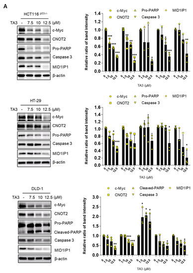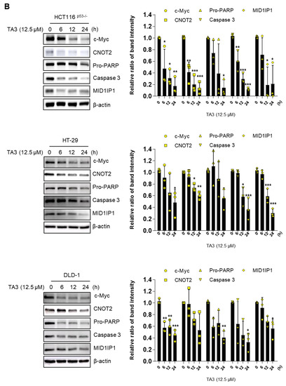 c-Myc is well known to play a vital role as an oncogene in human cancer cells [27,28]. In addition, c-Myc is involved in cell proliferation, cell cycle, metabolism, and survival in cancer cells [29]. Previously, we showed that the inhibition of CCR4-NOT transcription complex subunit 2 (CNOT2) induces apoptosis through MID1IP1 by activating p53 [17]. Furthermore, previous studies have shown that MID1IP1 regulates cancer cell growth through c-Myc regulation [8]. To check whether TA3 regulates c-Myc, CNOT2, and MID1IP1 expression, a Western blot assay was conducted in colon cancer cells. As shown in Figure 2A,B, TA3 inhibited c-Myc, CNOT2, and MID1IP1 expression in a dose- and time-dependent manner. Furthermore, when cells were treated with TA3, increased apoptosis was confirmed by changes in the expression of apoptotic proteins pro-PARP and caspase 3.