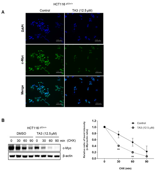 Next, we checked c-Myc expression using immunofluorescence. As shown in Figure 3A, c-Myc expression was decreased by TA3 treatment. After this, we sought to determine how TA3 regulates c-Myc protein levels. TA3 reduced the stability of c-Myc’s half-life in HCT116p53+/+ cells in the presence of cycloheximide compared with the DMSO (control) group (Figure 3B).
