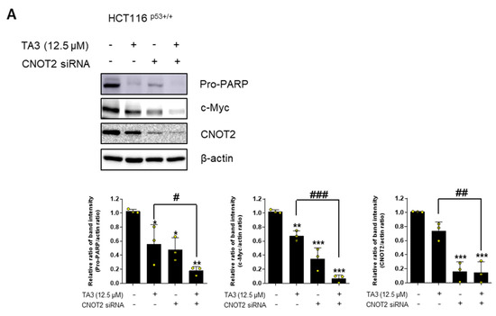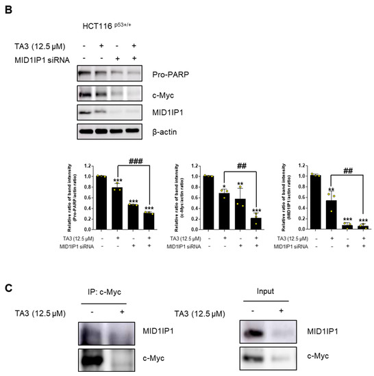 TA3 inhibits c-Myc and induces apoptosis via CNOT2 or MID1IP1. (A) HCT116p53+/+ cells were transfected with CNOT2 siRNA or control siRNA for 48 h and then cells were treated with TA3 (12.5 μM) for 24 h (three independent experiments in HCT116p53+/+ cells). (B) HCT116p53+/+ cells were transfected with MID1IP1 siRNA or control siRNA for 48 h and then cells were treated with TA3 for 24 h (three independent experiments in HCT116p53+/+ cells). Statistical significance was analyzed using one-way analysis of variance (ANOVA) followed by Tukey’s test and the unpaired t-test. p-value indicates a significant difference between the groups. Quantification of protein expression is shown in the lower panel. * p < 0.01, ** p < 0.005, *** p < 0.001 vs. control; # p < 0.01, ## p < 0.005, ### p < 0.001 vs. only TA3-treated group. (C) HCT116p53+/+ cells were treated with TA3 for 24 h. Then, cells were harvested for co-immunoprecipitation assay.