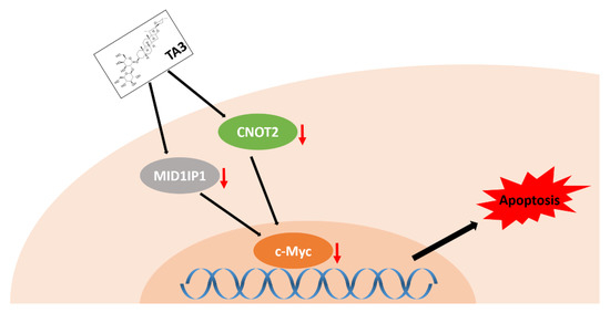 Our previous study showed that CNOT2 is related to MID1IP1 in regulating the expression of c-Myc and inducing apoptosis in cancer cells [8]. Additionally, knockdown of CNOT2 induces p53 expression and apoptosis via MID1IP1 [17]. From previous results, it can be considered that TA3 causes apoptosis through these mechanisms. Based on this information, we found that TA3 induced apoptosis via the TUNEL assay. Indeed, our Western blotting data revealed that TA3 attenuated the expression of pro-PARP and caspase 3, which are related to apoptosis in colon cancer cells. In addition, we found that TA3 inhibited c-Myc expression. Furthermore, our study showed that TA3 reduced c-Myc protein levels, and newly demonstrated that TA3 can regulate the expression of c-Myc rapidly induced by serum stimulation. Interestingly, we found that TA3 inhibited c-Myc through CNOT2 or MID1IP1.