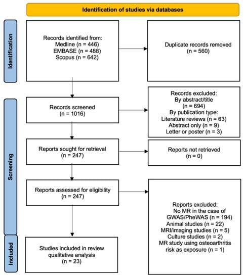 - Any studies that used genetic variation as a proxy (Lawlor definition) for an exposure to make causal inferences (not necessarily quantifying causal effect) regarding the effect of the instrumental variable on the outcome of osteoarthritis [12];