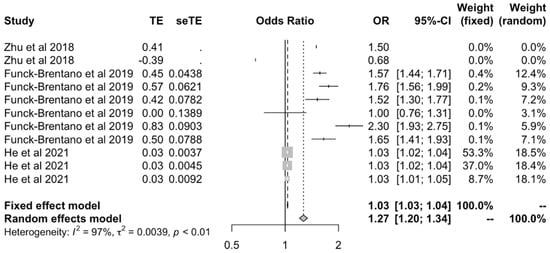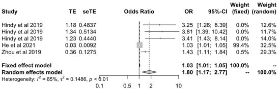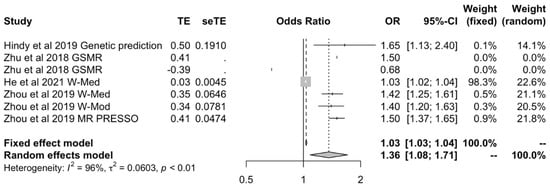 We then meta-analyzed studies that used the MR-Egger methods to include all OA outcomes [17,24,27] to assess whether results would support or rebut those from IVW data. This again showed a positive causal effect between BMI and all OA outcomes under both fixed (OR: 1.03 [1.01–1.05]) and random effects models (OR: 1.80 [1.17–2.77]) (Figure 3). Findings from the IVW and MR-Egger models were corroborated by MR studies that used various models to calculate OR and CI [17,21,24,27]. They corroborated the positive causal effect of BMI on OA when using fixed effects (OR: 1.03 [1.025–1.04]) or random effects models (OR: 1.36 [1.08–1.71]) (Figure 4).