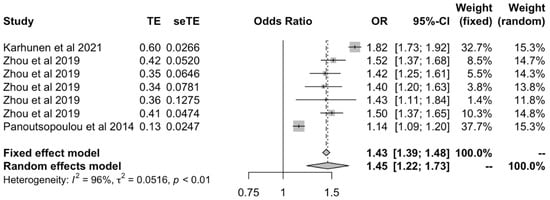 Samples were then stratified and analyzed by the ethnicity of the population investigated. In the meta-analysis of studies involving European individuals [21,23,24], there was a positive causal effect between BMI and all OA outcomes under both fixed (OR: 1.03 [1.027–1.04]) and random effects models (OR: 1.27 [1.20–1.34]) (Figure 5). In the analysis of studies involving White-British subjects [18,27,28], the effect was more marked than in European populations for the fixed and (OR: 1.43 [1.39–1.48]) random effects models (OR: 1.45 [1.22–1.73]) (Figure 6).