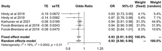 The analysis of LDL cholesterol values obtained by the IVW method [17,18,23] illustrated a protective effect of LDL on OA outcomes under both fixed effects (OR: 0.93 [0.91–0.95]) and random effects models (OR: 0.93 [0.90–0.96]) (Figure 8).