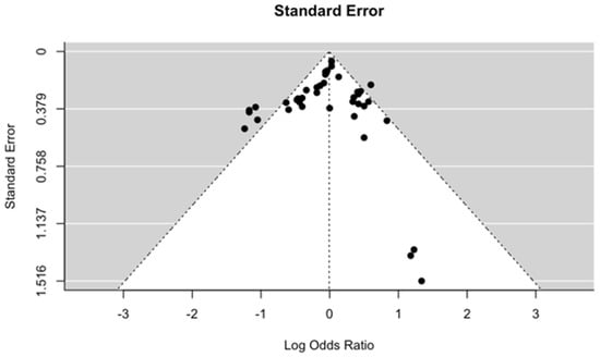 There are no standardized tools to ascertain the risk of bias in MR studies. Thus, to assess the quality of the included studies, we evaluated whether the three assumptions of MR were validated, and the method used for those validations. We constructed funnel plots to assess publication bias under both fixed effects (Figure 9) and mixed effects (Figure 10) meta-regression models when the standard error was used as the predictor. Under both conditions, there was no evidence of publication bias from the test for funnel plot asymmetry. The p-values for fixed and mixed effects (restricted maximum likelihood) were 0.159 and 0.822, respectively. We also constructed funnel plots when the sampling variance, inverse standard error and inverse sampling variance were used as predictor (Figure A1 and Figure A2, Appendix B).