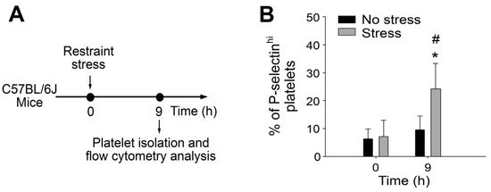 Percentage of circulating P-selectinhi platelets was up-regulated after restraint stress in mice. (A) Experiment outline of restraint stress mouse model and platelet analysis. (B) Percentage of platelets expressing high surface P-selectin (P-selectinhi) levels of mice with or without restraint stress at 0 and 9 h was detected by flow cytometry. Error bars show standard deviation; * p < 0.05, vs. 0 h groups; # p < 0.05, vs. no stress groups. n = 6 (three experiments with total six mice per group).