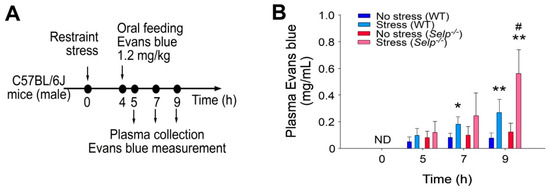 P-selectin deficiency exacerbates restraint stress-induced GI leakage in mice. (A) Experiment outline of restraint stress mouse model with Evans blue treatment. (B) Plasma Evans blue levels of wild-type (WT; C57BL/6J; Selp+/+; male) and P-selectin gene knockout (KO; Selp−/−; male) mice with or without restraint stress at 0, 5, 7, and 9 h. ND: not detected. Error bars shows standard deviation; * p < 0.05, ** p < 0.01, vs. respective no stress control groups; # p < 0.05, vs. WT groups. n = 6 (three experiments with total six mice per group).