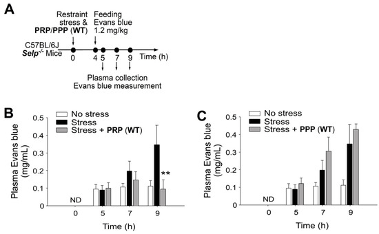 Wild-type (WT) mouse-derived platelet rich plasma (PRP) but not platelet-pool plasma (PPP) rescues stress-induced gut leakage in Selp−/− mice. (A) Experiment outline of restraint stress mouse model with Evans blue treatment. (B) Plasma Evans blue levels of Selp−/− mice without restraint stress (no stress) and with stress (stress) and stress plus PRP (WT) rescue (stress + PRP) at 0, 5, 7, and 9 h. ND: not detected. (C) Plasma Evans blue levels of Selp−/− mice without restraint stress (no stress) and with stress (stress) and stress plus PPP (WT) rescue (stress + PPP) at 0, 5, 7, 9 h. ND: not detected. ** p < 0.01, vs. respective stress groups. n = 6 (three experiments with total six mice per group).