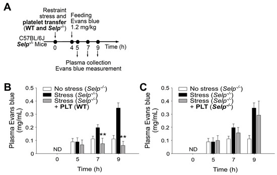 Transfer of wild-type (WT) washed platelets rescues stress-induced gut leakage in P-selectin-deficient (Selp−/−) mice. (A) Experiment outline of restraint stress mouse model with Evans blue treatment. (B) Plasma Evans blue levels of Selp−/− mice without restraint stress (no stress) and with stress [stress (Selp−/−)] and stressed Selp−/− mice transferred with wild-type platelets [stress (Selp−/−) + PLT (WT)] at 0, 5, 7, and 9 h. ND: not detected. (C) Plasma Evans blue levels of mice without restraint stress (no stress) and with stress (stress) and stressed wild-type mice transferred with platelets derived from Selp−/− mice [stress (Selp−/−) + PLT (Selp−/−)] at 0, 5, 7, and 9 h. ND: not detected. ** p < 0.01, vs. respective stress groups. n = 6 (three experiments with total six mice per group).