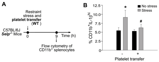 Stress-induced up-regulation of splenic CD11b+IL-1βhi proinflammatory monocytes was ameliorated by platelet transfer in mice. (A) Experiment outline of restraint stress mouse model. (B) Flow cytometry analysis of CD11b+IL-1βhi monocytes from Selp−/− mice with or without stress, and with or without wild-type (WT) platelet transfer. CD11b: monocyte marker; IL-1β: pro-inflammatory cytokine. * p < 0.05 vs. no stress groups; # p < 0.05 vs. without platelet transfer groups. n = 6 (three experiments with total six mice per group).