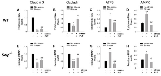 Relative mRNA expression levels of tight junction and stress-induced genes. Through qRT-PCR analysis, the relative mRNA expression levels of tight junction (CLDN3 and OLCN) (A,B,E,F) and stress-induced (ATF3 and AMPK) (C,D,G,H) genes, of wild type (WT; Selp+/+) (A–D) and P-selectin-deficient (Selp−/−) (E–H) mice in the duodenum with or without 9 h of restraint stress. The mRNA expression levels of control (no stress) groups were normalized to one-fold. * p < 0.05, ** p < 0.01, vs. respective no stress control groups. # p < 0.05, ## p < 0.01, vs. respective stress control groups without platelet transfer. n = 4 (two experiments with total four mice per group).