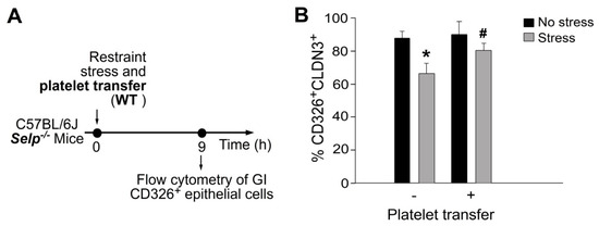Stress-induced suppression of CLDN3 expression in GI CD326 epithelial cells was ameliorated by platelet transfer in mice. (A) Experiment outline of restraint stress mouse model. (B) Flow cytometry analysis of CD326+CLDN3+ epithelial cells from Selp−/− mice with or without stress, and with or without wild-type (WT) platelet transfer. CD326: epithelial cell marker; CLDN3: tight junction protein. * p < 0.05 vs. no stress groups; # p < 0.05 vs. without platelet transfer groups. n = 6 (three experiments with total six mice per group).