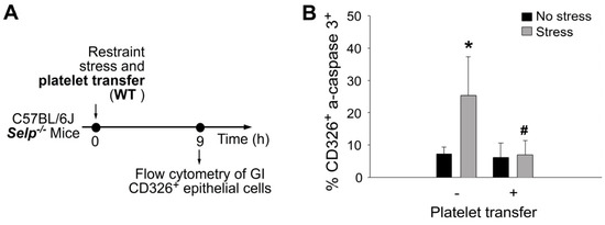 Stress-induced apoptosis of GI CD326+ epithelial cells are rescued by platelet transfer in mice. (A) Experiment outline of restraint stress mouse model. (B) Flow cytometry analysis of GI CD326+ epithelial cells from Selp−/− mice with or without stress, and with or wild-type (WT) platelet transfer. CD326: epithelial cell marker; active-form caspase 3 (a-caspase 3): apoptotic cell marker. * p < 0.05 vs. no stress groups; # p < 0.05 vs. without platelet transfer groups. n = 6 (three experiments with total six mice per group).