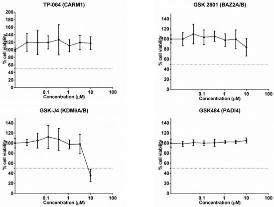 The Structural Genomics Consortium (SGC) is an international public–private partnership with the goal of supporting research for a better understanding of human disease biology and to enable the discovery of new medicines (https://www.thesgc.org, accessed on 25 January 2019). To this end, SGC develops and makes available highly specific inhibitors (chemical probes) to the scientific community [11,12,13]. Most available epigenetic probes are inhibitors of bromodomains (BRDs) and protein methyltransferases (PMTs). These molecules have been shown to be effective in several tumor models by inhibiting or attenuating several characteristics relevant to tumor development, such as metastatic capacity and resistance to conventional treatment [14,15,16]. However, epigenetic inhibitors used at adequate doses can inhibit tumorigenic phenotypes without being overtly cytotoxic to cells from healthy tissues [17].