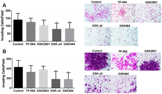 Inhibition of the epigenetic targets KDM6A/B and PADI4 reduced cell invasiveness compared to the control group (p < 0.05) in the A549 and H1568 cell lines (Figure 2).