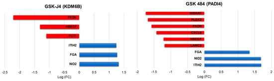 In cells treated with the PADI4 inhibitor, we found nine genes differentially regulated and six genes in cells treated with the KDM6A/B inhibitor, of which the following five genes were common among the treatments: the genes for Fibrinogen Alpha Chain (FGA), Nidogen 2 (NID2), Inter-Alpha-Trypsin Inhibitor Heavy Chain 2 (ITIH2), Peroxidasin (PXDN) and Heparin Binding EGF Like Growth Factor (HBEGF). All of the five genes common among the treatments are related to adhesion proteins, cell ligands, and protein stabilizing proteins of the extracellular matrix, suggesting that these genes participate in the regulation of metastasis (Figure 3).
