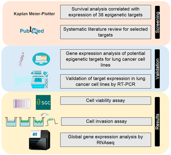 A streamlined set of in silico analyses coupled with in vitro analyses (Figure 4) was performed to evaluate and rank potential epigenetic targets based on epigenetic probes from the SGC (https://www.thesgc.org, accessed on 25 January 2019). The screening was based on a list of available epigenetic inhibitors from SGC, followed by an analysis of the association of the epigenetic target with NSCLC survival, subsequent selection by a systematic review of potential new cancer targets, in silico analysis of protein expression in NSCLC cell lines, and real-time qPCR expression to evaluate target expression in the cell lines.