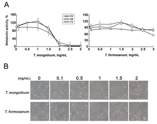 We first tested the effect of extracts from T. mongolicum and T. formosanum on the metabolic activity of the MDA-MB-231 TNBC cells. The MTT assays showed that T. mongolicum decreased metabolic activities among MDA-MB-231 cells, and the effect was dose-dependent; T. formosanum did not (Figure 1A). We also observed that, at higher concentrations of T. mongolicum, the cells assumed a smaller size and irregular morphology (Figure 1B).