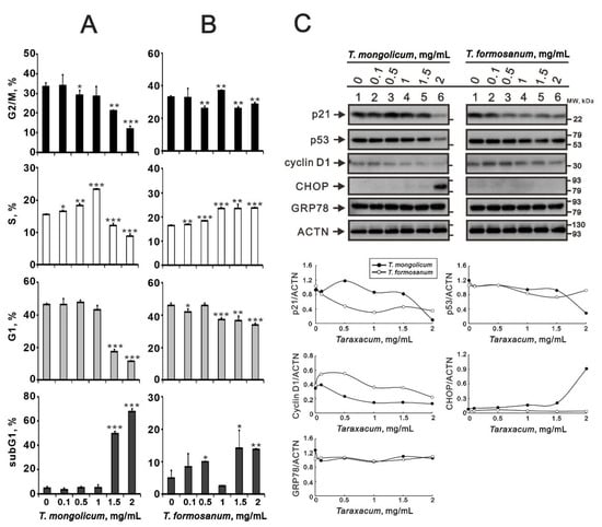 To investigate the mechanism(s) underlying T. mongolicum cytotoxicity, we next used cytometry for cell cycle analysis. We found that, at concentrations of 1.5 mg/mL or greater, T. mongolicum significantly induced subG1 populations while significantly decreasing the G1, S, and G2/M phase populations (Figure 2A). T. formosanum induced dose-dependent effects on the subG1 and S populations and decreased G1 populations (Figure 2B). Our previous data demonstrated that dose-dependent declines in these p53, cyclin D1, and p21 proteins were detected when cells were treated with T. mongolicum and T. formosanum in one human cervical cancer cell line, i.e., HeLa cells []. Analysis of the expression profiles of cell-cycle-related proteins, including p21, p53, and cyclin D1, revealed that T. mongolicum induced dose-dependent declines in the profiles of MDA-MB-231 cells (Figure 2C). Except for p53, T. formosanum induced dose-dependent declines in the profiles of p21 and cyclin D1 proteins. CHOP, one of the key unfolded protein response proapoptotic players, was positively transcribed by the PERK–eIF2–ATF4 axis for endoplasmic reticulum stress [,]. We observed the induction of CHOP by T. mongolicum in MDA-MB-231 cells, which was similar to our previous study []; T. formosanum did not induce CHOP. The GRP78 protein, an endoplasmic reticulum stress sensor protein, remained at a constant level.