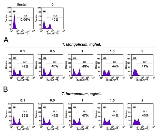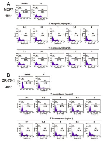 Figure 3 shows that MDA-MB-231 cell proliferation was suppressed by 2 mg/mL T. mongolicum; however, it was enhanced by T. formosanum. Both T. mongolicum and T. formosanum decreased the MCF-7 cell proliferation (Figure 11A); however, they enhanced the proliferation of ZR-75-1 cells based on BrdU incorporation (Figure 11B).