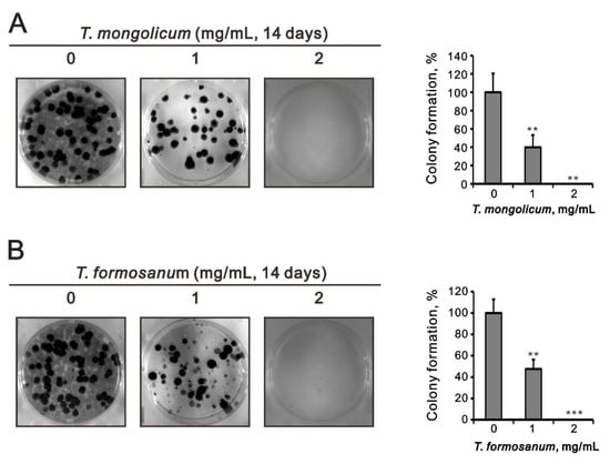 Effects of T. mongolicum and T. formosanum on colony formation by MDA-MB-231 cells. MDA-MB-231 cells were treated for 14 days with the indicated concentrations of (A) T. mongolicum or (B) T. formosanum. They were then subjected to colony formation analysis. The results are representative of three independent experiments. Bars depict the mean ± SD. ** p < 0.01. *** p < 0.001.