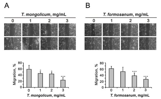 Effect of T. mongolicum and T. formosanum on MDA-MB-231 cell migration. MDA-MB-231 cells were treated with the indicated concentrations of (A) T. mongolicum or (B) T. formosanum. After 20 h, the cell migration was measured. The results are representative of two independent experiments. Bars depict the mean ± SD. * p < 0.05, *** p < 0.001.
