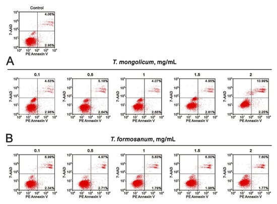 The increase in subG1 populations suggests that T. mongolicum cytotoxicity might involve the induction of apoptosis. To test that idea, we used Annexin V and 7-AAD kits to assess the induction of apoptosis and necrosis by T. mongolicum. Annexin V is a member of the annexin family of intracellular proteins that binds to phosphatidylserine (PS) in a calcium-dependent manner. In healthy cells, PS is only distributed in the inner leaflet of the cell membrane lipid bilayer; however, during early apoptosis, membrane asymmetry is lost, and PS is translocated to the outer leaflet, where Annexin V binds to it, differentiating the healthy cells from the apoptotic ones. The cells were also exposed to 7-AAD solution to help distinguish apoptotic from necrotic cells. Early apoptotic cells exclude 7-AAD, while late apoptotic or necrotic cells do not, enabling the dye to pass into the nucleus and bind to DNA. At a concentration of 2 mg/mL, T. mongolicum increased the MDA-MB-231 cell population in late apoptosis (Figure 6); T. formosanum did not.