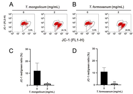 Effects of T. mongolicum and T. formosanum on mitochondrial membrane potential in MDA-MB-231 cells. MDA-MB-231 cells were treated with 2 mg/mL of (A) T. mongolicum or (B) T. formosanum for 24 h. Mitochondrial depolarization was measured as a function of a decrease in the red/green (FL2-H/FL1-H) fluorescence intensity ratio. (C,D) are the results of three independent experiments. Symbols and bars depict the mean ± SD. * p < 0.05, ** p < 0.01.