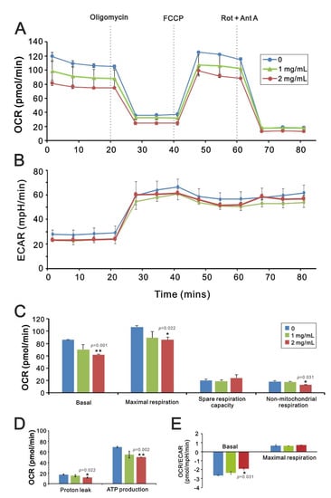 We then analyzed the effects of T. mongolicum on mitochondrial respiration, glycolysis, and ATP production in MDA-MB-231 cells based on measurements of the oxygen consumption rate (OCR) and extracellular acidification rate (ECAR) using a Seahorse XF analyzer. Our results show that T. mongolicum dose-dependently decreased the OCR but not the ECAR (Figure 8A,B), which suggests its primary effect is on mitochondrial respiration, not glycolysis. At a concentration of 2 mg/mL, T. mongolicum significantly decreased basal respiration, maximal respiration, non-mitochondrial respiration, proton leakage, and ATP production (Figure 8C,D, p = 0.001, 0.022, 0.031, 0.022, and 0.002, comparing 2 mg/mL T. mongolicum with vehicle alone). Correspondingly, 2 mg/mL T. mongolicum also decreased OCR/ECAR ratios during basal respiration; however, it did not during maximal respiration (Figure 8E, p = 0.031, comparing 2 mg/mL T. mongolicum with vehicle alone).