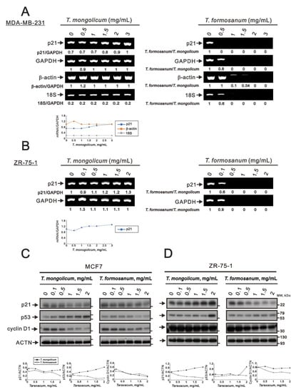 Effects of T. mongolicum and T. formosanum on transcriptional regulation in MDA-MB-231 cells. (A) MDA-MB-231 and (B) ZR-75-1 cells were treated for 24 h with the indicated concentrations of T. mongolicum or T. formosanum, after which their cell lysates were subjected to RT-PCR analysis using primer pairs against p21 mRNA, with GAPDH and β-actin mRNAs serving as mRNA loading controls and 18S rRNA as an internal control. (C,D) Western blot analysis using antibodies against the indicated proteins, with ACTN serving as the protein loading control. mRNA and protein bands were quantified through pixel density scanning and evaluated using ImageJ, version 1.44a (http://imagej.nih.gov/ij/) (accessed on 25 July 2022). The values of the GAPDH mRNA of T. mongolicum were calculated with the vehicle only, and other values were calculated as the indicated ratio.