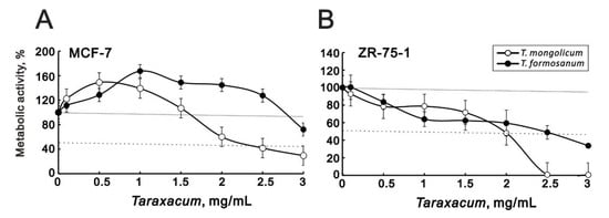 In the present study, we applied aqueous extracts from two species of Taraxacum, T. mongolicum and T. formosanum, to compare their potential antitumor effects against the MDA-MB-231 TNBC cell line and the ZR75-1 and MCF-7 hormone-dependent breast cancer cell lines.
