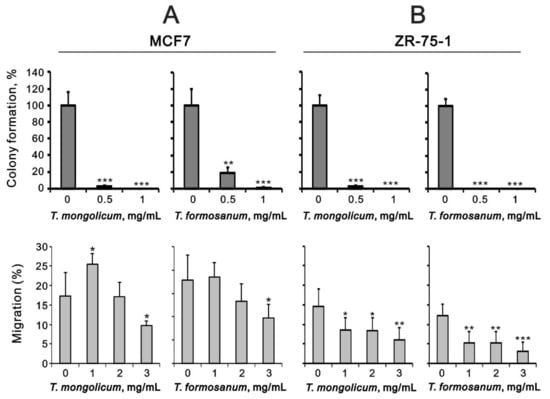 Effect of T. mongolicum and T. formosanum on colony formation by MCF-7 and ZR-75-1 cells. (A) MCF-7 and (B) ZR-75-1 cells were treated with the indicated concentrations of T. mongolicum or T. formosanum. Colony formation (top) was measured after 14 days, and cell migration (bottom) was measured after 24 h. The results are representative of two independent experiments. Bars depict the mean ± SD. * p < 0.05, ** p < 0.01, *** p < 0.001.