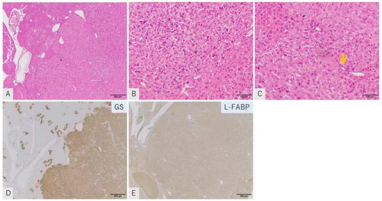 The histopathological characters of the GS-positive tumors were as previously reported [,,]. Tumors comprised atypical hepatocytes in an irregular trabecular structure. Fibrous capsules were not observed. A substitutional growth pattern was observed in the border to background liver and portal invasion was frequently observed (Figure 1A–C). Immunohistochemically, no GS-positive tumor showed L-FABP attenuation (Figure 1D,E). Taken together, the GS-positive tumors were considered to include lesions in the sequence of progression from dysplastic nodule to well-differentiated HCC.