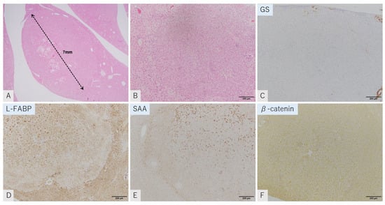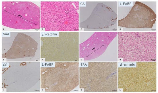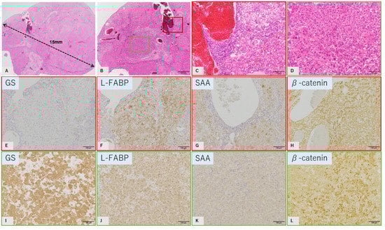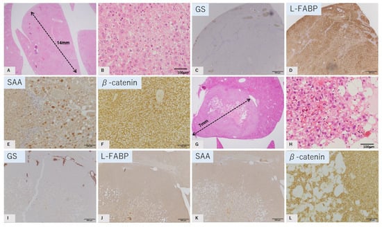 Two tumors (tumors 2 and 4) showed similar pathological and immunohistochemical findings to human inflammatory HCA. Hepatocytes showed trabecular structure with dilatation of sinusoids. Pseudoglandular hepatocellular arrangements were occasionally observed, in addition to thick-walled vessels and sparse aggregation of inflammatory cells. An invasive growth pattern was not observed (Figure 3A,B,G,H). Immunohistochemically, these tumors did not show reduced expression of L-FABP. Some intense SAA expression was observed in one case. Another case did not show intense SAA expression; however, the histopathological characteristics were quite similar to those of inflammatory HCA. β-catenin was expressed only in the cell membrane (Figure 3C–F,I–L).