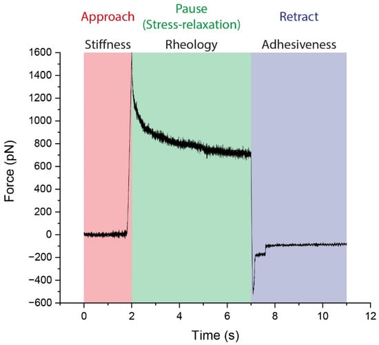 Force vs. time curve. Colored scheme showing the mechanical information derived from each of the different segments in one experiment: elastic modulus and stiffness (from the initial deformation and the slope, subsequently), stress relaxation (by fitting the decay obtained when fixing the Z position of the indenting tip during the pause time it is possible to elucidate the relaxation time), and adhesion-related factors (the minimum of the peak indicates the maximum adhesive force, and the integration of the area under the curve relates to the adhesion work).