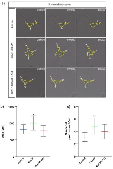 It was previously shown how the stimulation of metabotropic P2Y13 receptor was sufficient to modify the cell motility of postnatal cerebellar astrocytes in primary cell cultures []. To explore whether the activation of the ionotropic P2X7 receptor may also induce changes in the cell size and migration of this cell population, cerebellar astrocytes were incubated in the presence or absence of the selective agonist of the P2X7R, BzATP (300 µM), for 1 h. Astrocytes were subsequently placed on a time-lapse video microscopy device and monitored for 3 h, acquiring bright field images every 5 min. These experiments allowed us to measure the cell size (area in µm2) and the distance covered by the astrocytes in the plate culture. As shown in Figure 2 and the values in Table 1, the treatment with BzATP resulted in a significant increase in the cell size of astrocytes (1001 µm2 in treated cells versus 812 µm2 in control cells, at 20%). Importantly, this change was avoided in the presence of the P2X7R antagonist A43 (10 µM), pointing to the P2X7 receptor as the responsible for the effects observed. Cell size of astrocytes pretreated with A43 and BzATP was 765 µm2. The number of membrane protrusions in the isolated astrocytes was also measured. While untreated astrocytes exhibited 3.10 protrusions/cell, cell treatment with BzATP increased the number of protrusions (4.85). Moreover, the P2X7R antagonist A43 also reduced the BzATP effect (3.96) (Figure 2a,c).