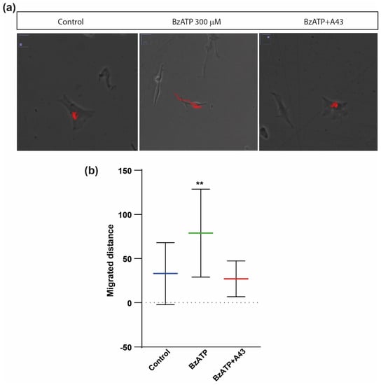 Next, we tested whether cell migration was also affected by the stimulation of the P2X7 receptor, assessed by measuring the distance covered by the astrocytes throughout the imaging experiments. As shown in Figure 3 and Table 1, BzATP induced a significant increase in the distance covered by individual astrocytes. Similar to what was observed for cell size measurements, the effect on cell motility was also blocked by the presence of A43, further confirming the involvement of the P2X7 receptor in the increase in astrocytic migration capacity.