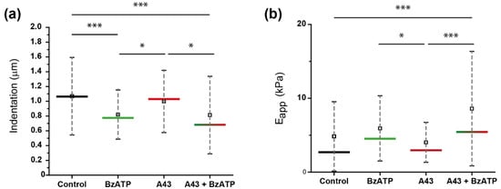 To solve the aforementioned issue, the mechanical response of rat cerebellar astrocytes upon treatment (for 1 h) with BzATP (300 µM), either in the presence or absence of the P2X7R antagonist A43, was determined by means of AFM indentation experiments. Figure 4 and Table 2 indicate the cell indentation required to reach a pre-defined loading force of 1.5 nN and the correlated apparent Young’s modulus values (Eapp) for the respective astrocytes after the different treatments (Table S1 in the Supplementary Materials section shows further calculated parameters).